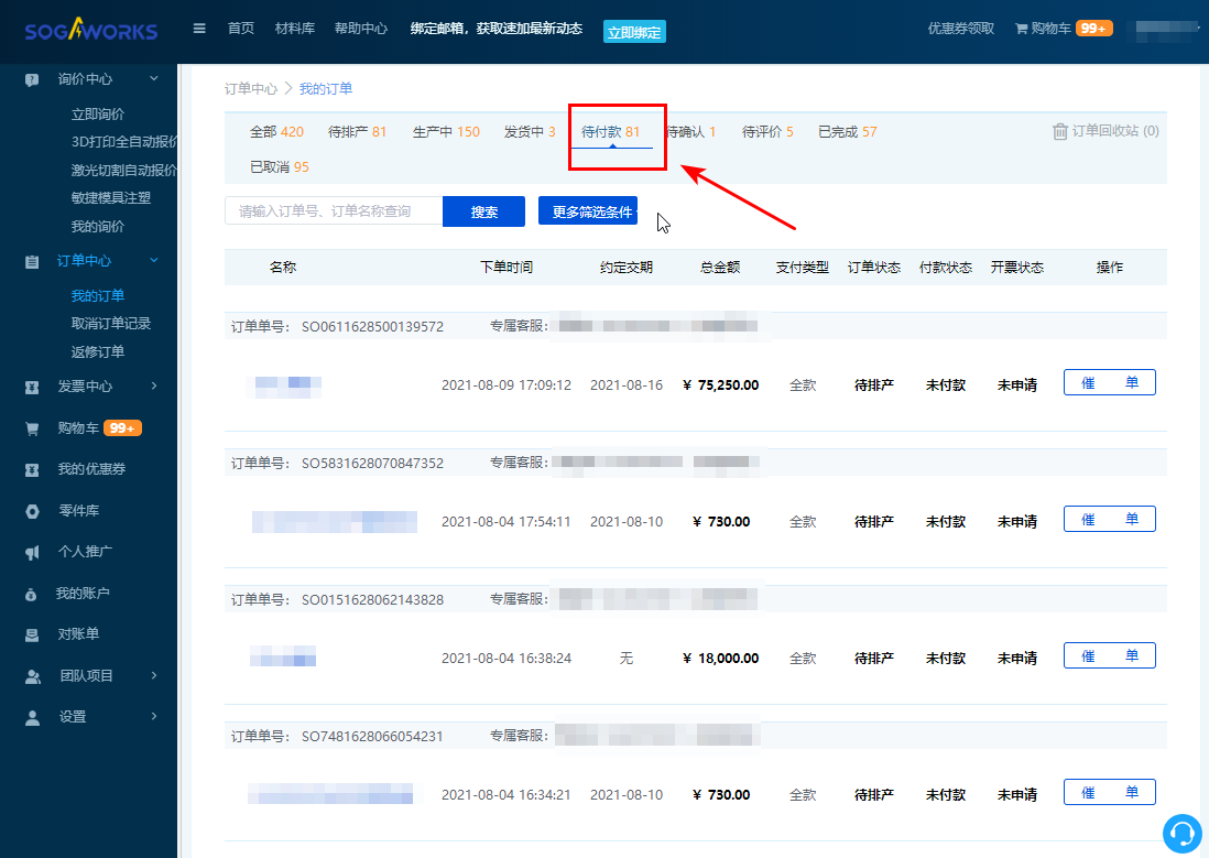 4. 點擊【待付款】,進入代付款訂單列表